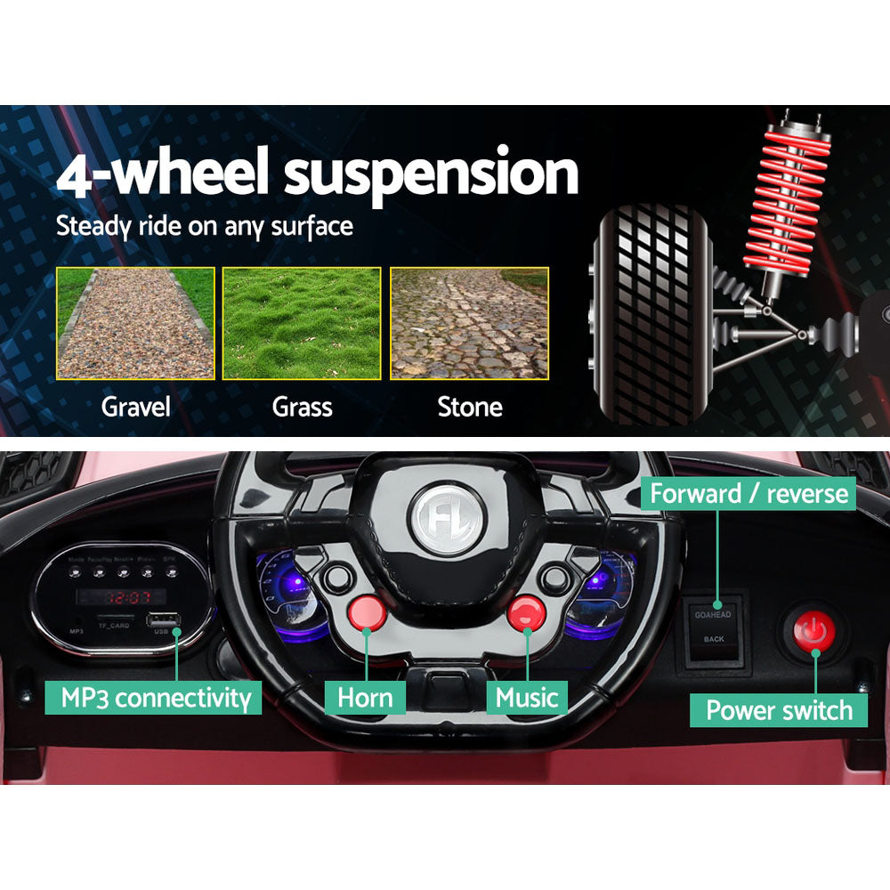 Our ride on car is sure to impress your little driver with its looks, performance, and charisma. It boasts an impressive and exquisite two-tone design, brilliant lacquer finish accentuating its sculpted lines and a solid build. It has powerful twin motors for exhilarating performance and a thrilling ride, 4-wheel suspension for increased stability and comfortable ride, premium anti-slip tyres for a smooth ride and a spacious seat with a safety belt for safety and comfort. Plus, it has stylish working doors with a safety lock and dynamic headlights for illuminating presence and reverse lights for safety. Furthermore, it has a dashboard with functions like MP3 connect, power switch, accelerator pedal, horn, and forward/reverse switch for a real-like driving experience like never before. The remote-control function and EN71 Standard Safety of Toys certification ensure the safety of the child.